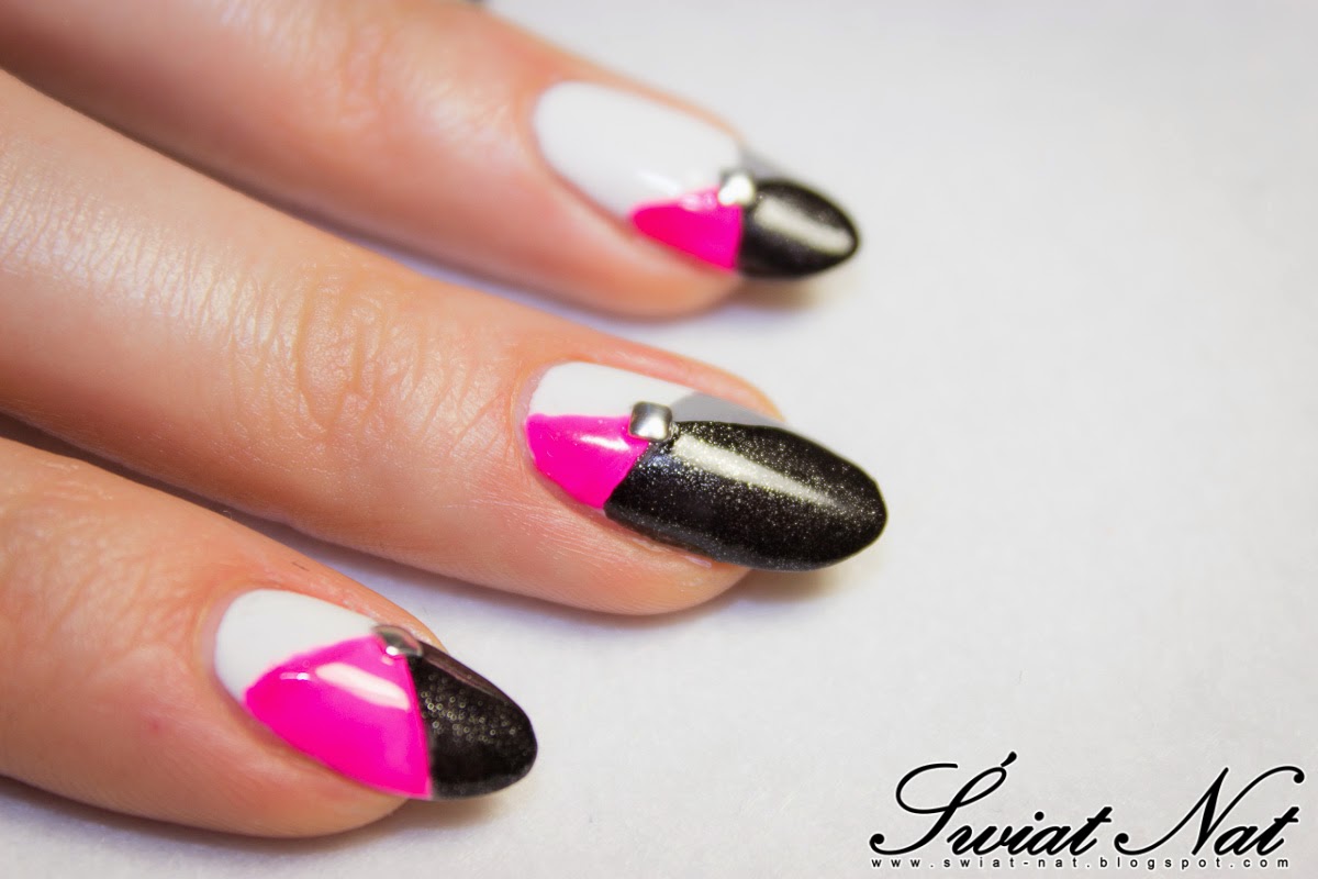 Początkowo miałam ich nie pokazywać, bo to, co zobaczyłam na monitorze mnie załamało. Ale koniec końców, może podpowiecie mi, jak robić zdjęcia, żeby ładnie uchwycić neony. Zaczęłam od pomalowania paznokci białym lakierem „od Chińczyka”. Następnie dodałam najciemniejszy trójkąt, czyli Mroczeq od Colour Alike oraz szary lakier Eel Skin Complete Salon Manicure od Sally Hansen. Na koniec zostawiłam sobie różowy neon Safari. Cudowny w butelce, cudowny na paznokciu, niestety na zdjęciu nie zachwycił. Nie wiem, czy to aparat oszalał od jaskrawości czy może był jakiś inny powód, ale można zauważyć, że w miejscu różowego lakieru pojawia się coś niepokojącego (żeby nie nazwać tego dosadniej). Całość zwieńczyłam srebrnymi kwadratowymi ćwiekami z Allepaznokcie, które swoją drogą pokochałam (nakładałam je na jeszcze mokry top coat):D